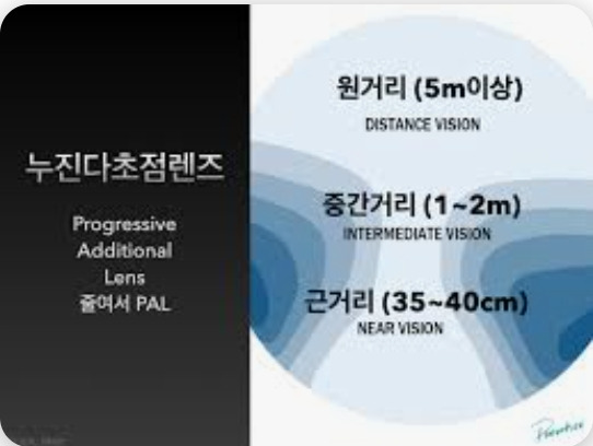 - 다초점렌즈는 위(원거리)–중간–아래(근거리) 로 시야가 나뉘므로,