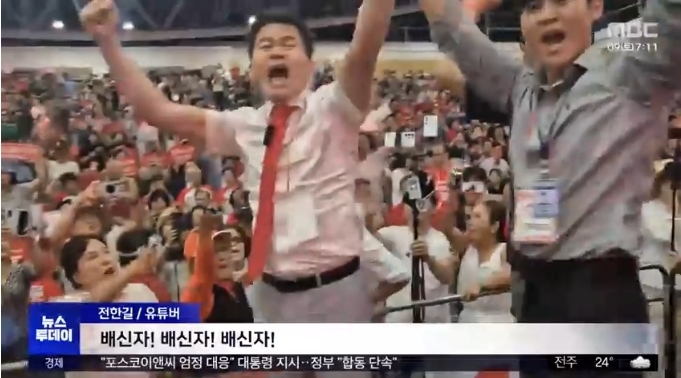 ■ "배신자" 연호 주도: 전 씨는 최고위원 후보로 나선 김근식 후보의 연설 도중 자리에서 일어나 "배신자"라고 외치며 청중들의 연호를 유도했습니다. 김 후보는 과거 윤석열 전 대통령 탄핵에 찬성하는 입장이었습니다.