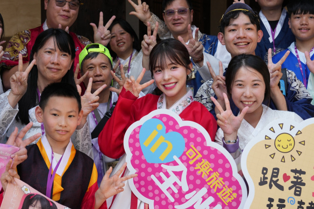 전주한옥마을에서 이다혜 치어리더와 사진을 찍는 대만 관광객. 사진 제공=한국관광공사