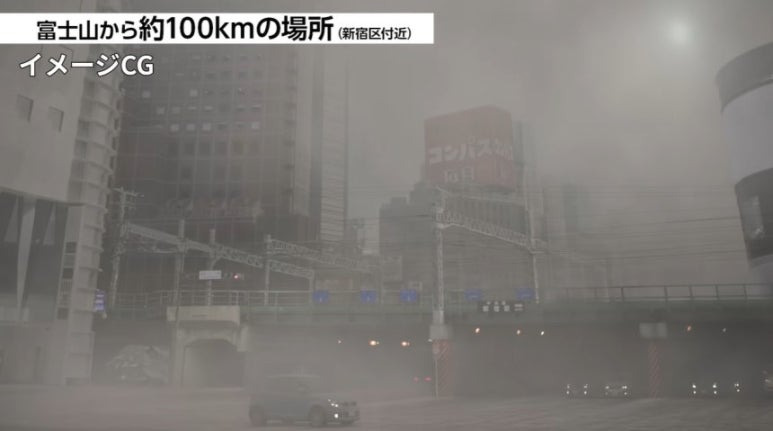 분화 후 단 3시간 만에 화산재가 도쿄 도심에 도달하며, 도쿄 신주쿠구에는 이틀 뒤 5cm 이상의 화산재가 쌓일 것으로 예상됩니다.