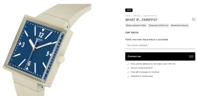 목적: 스와치는 이 시계가 '긍정적인 도발'이며, 미국의 불합리한 관세 정책에 대한 비판적 시각을 담고 있다고 설명했습니다.
