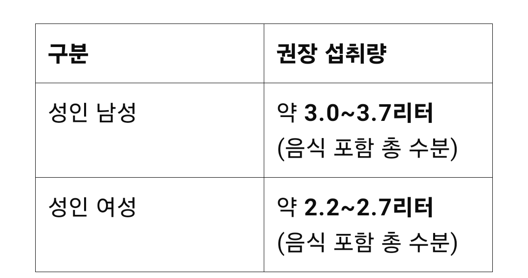 - 실제로 순수하게 마셔야 할 물은 남성 약 2.5~3리터, 여성 약 1.8~2.2리터 정도