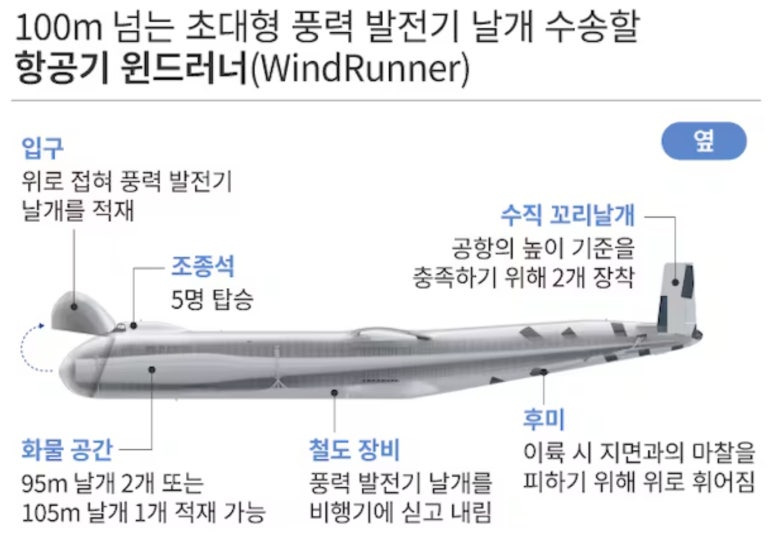 크기 제약 극복: 동체 내부에 날개를 싣는 방식이 아니므로, 현재 기술로도 수송이 불가능한 100m 이상의 초대형 날개도 운반할 수 있습니다.