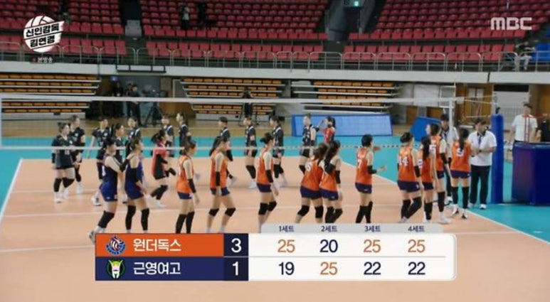 김연경의 원더독스가 첫 경기에서 근영여고를 꺾고 아찔한 1승을 올렸다.