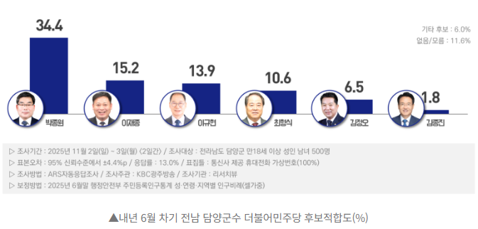 더불어민주당 담양군수 후보 적합도 조사에서는 박종원 도의원이 34.4%로 독주했다.