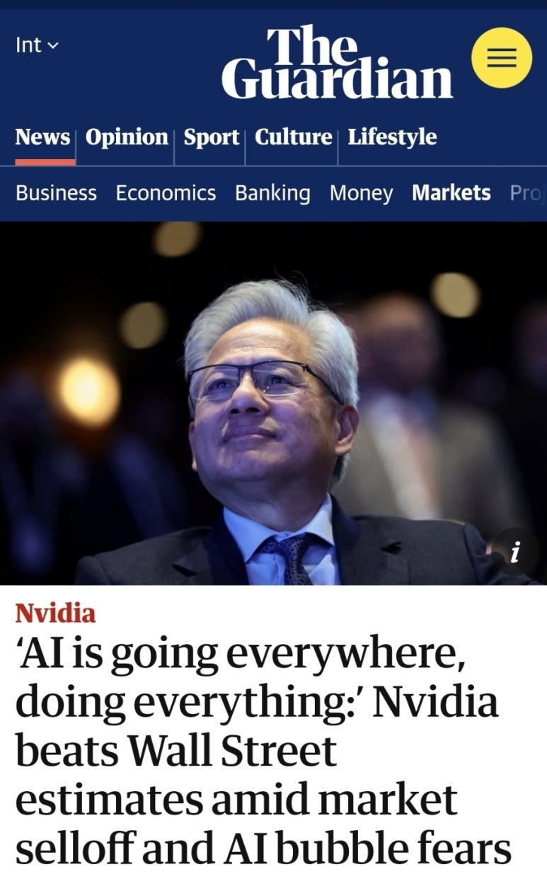 “AI는 모든 곳에 침투해 모든 일을 하고 있다: 엔비디아, 시장 급락과 AI 거품 우려 속에서도 월가 전망치를 뛰어넘다”