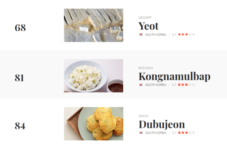 이번 순위에 이름을 올린 음식은 홍어, 엿, 콩나물밥, 두부전입니다. 이 순위는 전문 셰프나 미식 평론가의 평가가 아닌, 전 세계 일반 사용자들의 별점과 리뷰를 기반으로 산출됩니다.