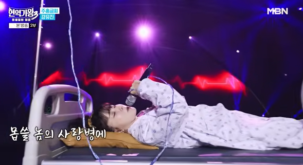 강유진은 인기 TV 프로그램 "현역가왕3"에서 환자복을 입고 등장하여 큰 화제를 모은 참가자입니다.