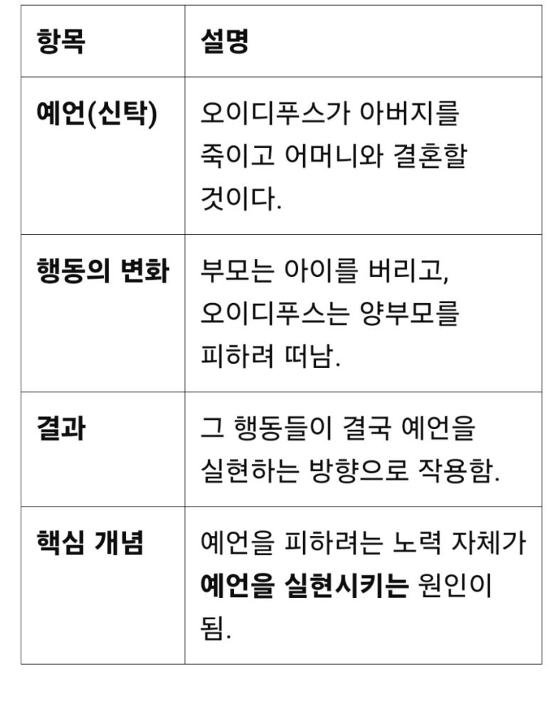 오이디푸스 신화는 자기충족적 예언의 고전적인 사례로, 예언이 사람들의 행동을 유도해 결국 현실로 실현되는 과정을 보여 줍니다.