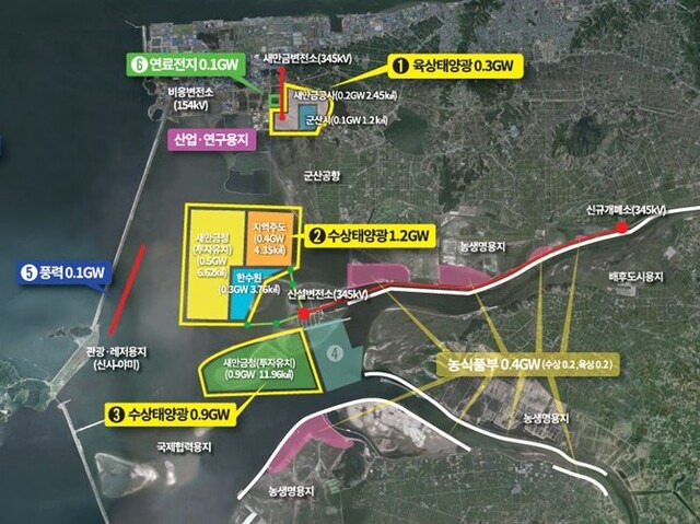 - 2018년 10월 한수원과 새만금개발청·산업부가 1.2 GW 규모 수상태양광 사업을 위해 협약을 체결했으나, 이후 2025년 현재까지 송전선·변전소 등 전력 인프라에 대한 분담 합의도 이뤄지지 않았고, 산업부의 공사계획 인가도 받지 못한 상태입니다