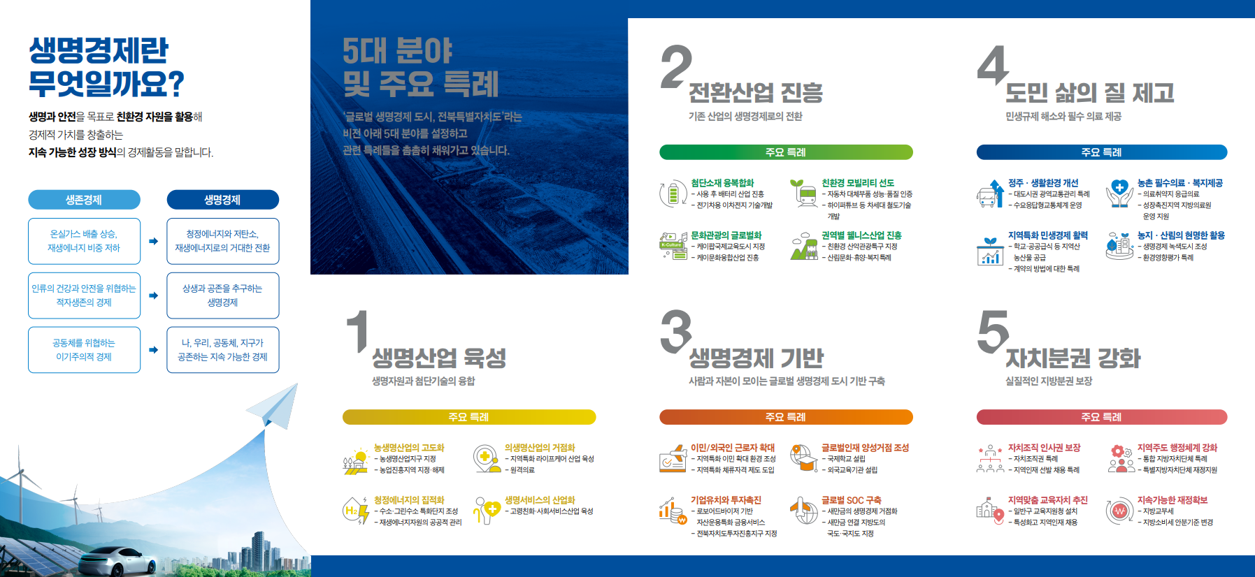 2024년 12월 27일 전부개정에 따라 시행된 「전북특별자치도 설치 및 글로벌생명경제도시 조성을 위한 특별법」은 지역발전과 도민 삶의 질 향상을 위해 5대 핵심산업과 3대 기반 특례를 구체화하고 있습니다.