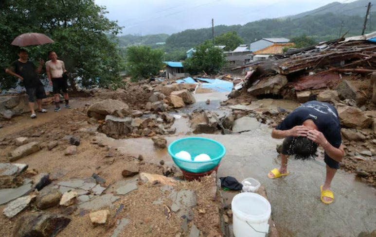 21일 경남 산청군 산청읍 병정마을에서 주민과 자원봉사자가 수해 복구작업 중 흐르는 물로 머리를 씻고 있다.