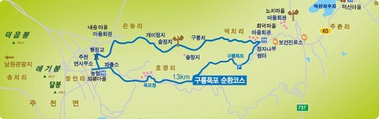 지리산둘레길입구정류장→지리산둘레길시작점안내판→징검다리→내송마을→개미정지→구룡치→사무락다무락→연리지→회덕마을→구룡폭포→구룡계곡→육모정→호경리마을→지리산둘레길입구정류장