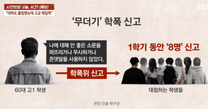 JTBC 〈사건반장〉은 30일 올해 경남의 한 고등학교에 입학한 60대 남성 때문에 학생들과 교사, 교육청 관계자까지 고충을 겪고 있다는 제보를 보도했습니다. 대학까지 졸업한 이 남성은 지난 3월, 고등학교 1학년으로 입학했습니다.
