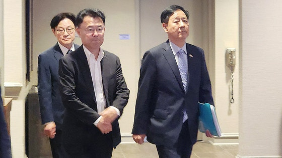 구윤철 부총리 겸 기획재정부 장관(오른쪽)이 30일(현지시간) 워싱턴DC 미국 상무부 청사에서 하워드 러트닉 미 상무장관과 통상협의를 하기 위해 숙소를 나서고 있다. 맨 왼쪽은 김정관 산업통상자원부 장관. 연합뉴스