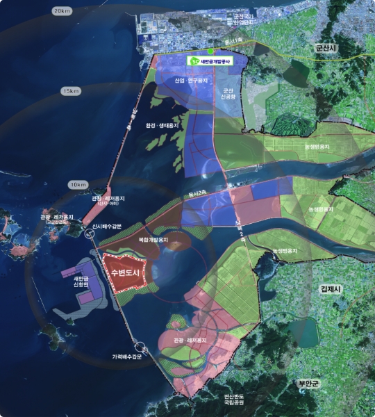 새만금 수변도시는 새만금 지역 내 최초로 조성되는 계획도시로, 2023년 6월 매립공사를 완료하고 12월부터 도시 기반 시설 조성공사를 본격적으로 시작하였습니다. 이 도시는 약 6.6㎢(200만 평) 면적에 인구 2만 5천 명 규모의 친환경 복합도시를 목표로 하고 있으며, 2026년 하반기 준공을 목표로 하고 있습니다.