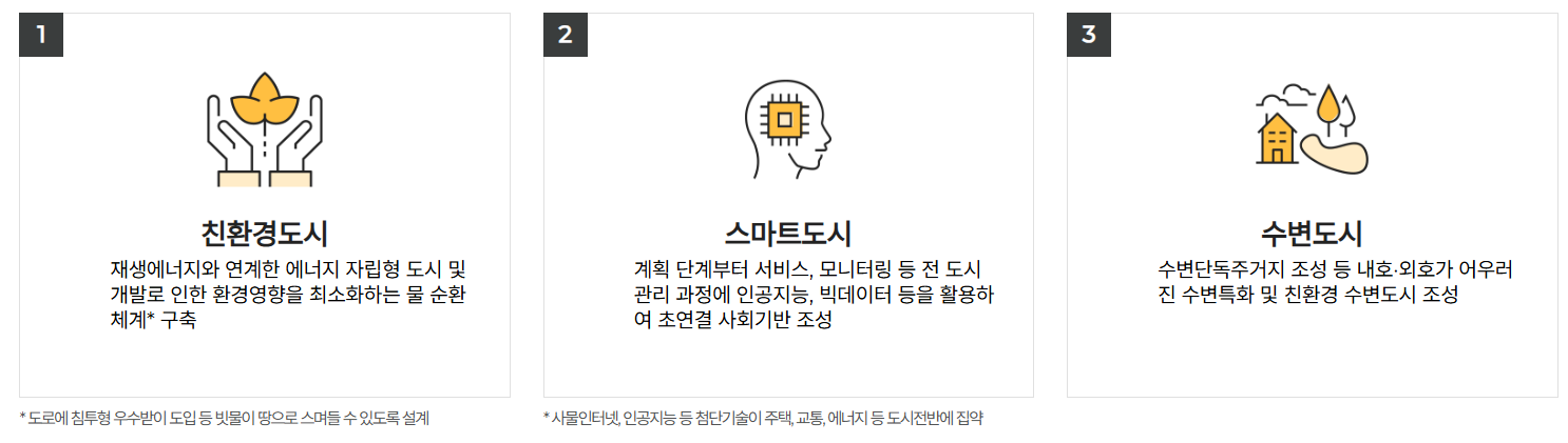 새만금 수변도시는 친환경적이고 스마트한 도시를 지향하며, 공원, 녹지, 농지, 친수공간 등 탄소 흡수 공간을 적극적으로 조성하고, 대중교통 중심의 체계를 도입하여 에너지 절감형 도시를 구축할 계획입니다. 또한, 도시 내에는 교육, 의료, 관광, 첨단산업 등 다양한 정주 환경 핵심 시설을 유치하여 자족 기능을 갖춘 도시로 개발될 예정입니다.