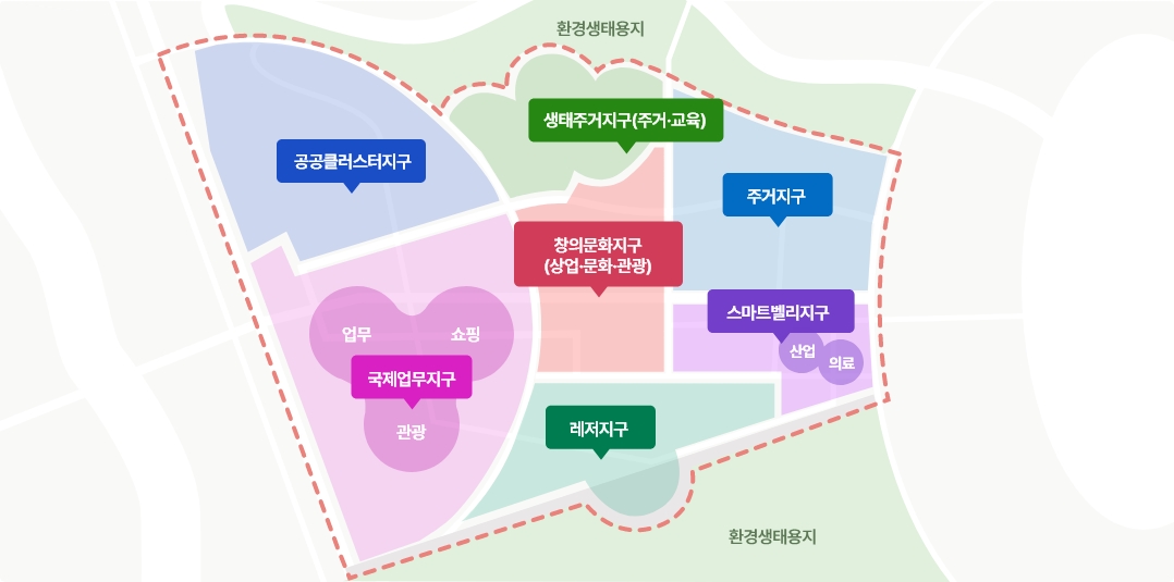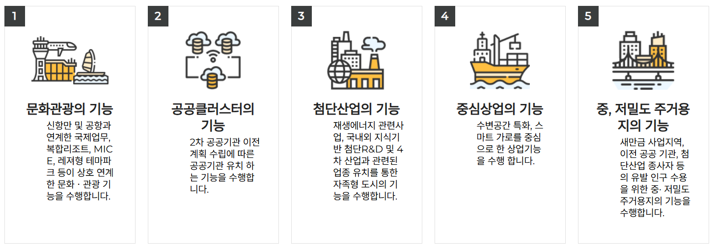 새만금 스마트 수변도시는 전통적인 토지 공급방식과는 다르게 접근하고 있다. 다른 도시처럼 공동 주택용지를 먼저 분양하는 것이 아니라 교육·의료·관광·첨단산업 같은 정주 환경의 핵심 시설을 먼저 유치해서 자연스럽게 도시가 자리 잡도록 하는 전략을 세우고 있다.